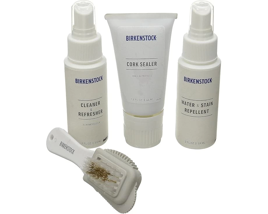 Keep your Birkenstock® fresh, clean, and looking like new with the handy Deluxe Shoe Care Kit.SKU: #8425883Cork sealer keeps cork from drying out and getting brittle.Cleaner and refresher eliminates odor on all types of footbeds.Water and stain repellant protects fine leather, suede, nubuck, and textiles.Suede and nubuck leather brush gently cleans the surface and hard to reach places.Made in the U.S.A.
