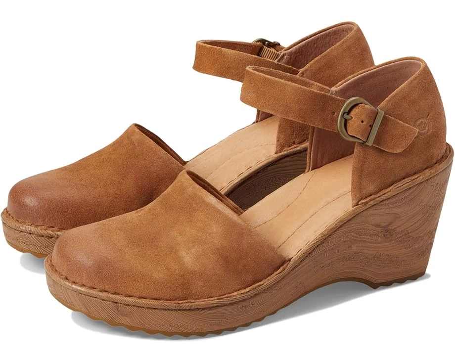 Take your styling game to a whole new level by wearing the Børn® Nellie sandals. SKU: #9760480Pebbled leather upper. Breathable textile lining with a cushioned footbed for added comfort. Round toe silhouette. Wooden wedge heel. Adjustable buckle closure on the ankle strap with a closed-back design. Durable synthetic outsole. Imported. Product measurements were taken using size 9, width M (B). Please note that measurements may vary by size.Weight of footwear is based on a single item, not a pair.Measurements:
