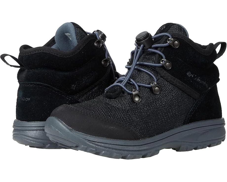 The Columbia® Kids Fairbanks™ Mid are the perfect hiking boot for your little one to be just one step behind.SKU: #9519111Easy to fasten bungee lacing system offers an adjustable lock for a perfect fit.High-top hiking boot with an extra padded collar and tongue.Pull tab at heel for easy access.Wide toe box for better movement.Leather and textile upper.Textile lining and footbed.Synthetic outsole.Imported.Product measurements were taken using size 1 Little Kid, width M. Please note that measurements may vary by size.Weight of footwear is based on a single item, not a pair.Measurements: