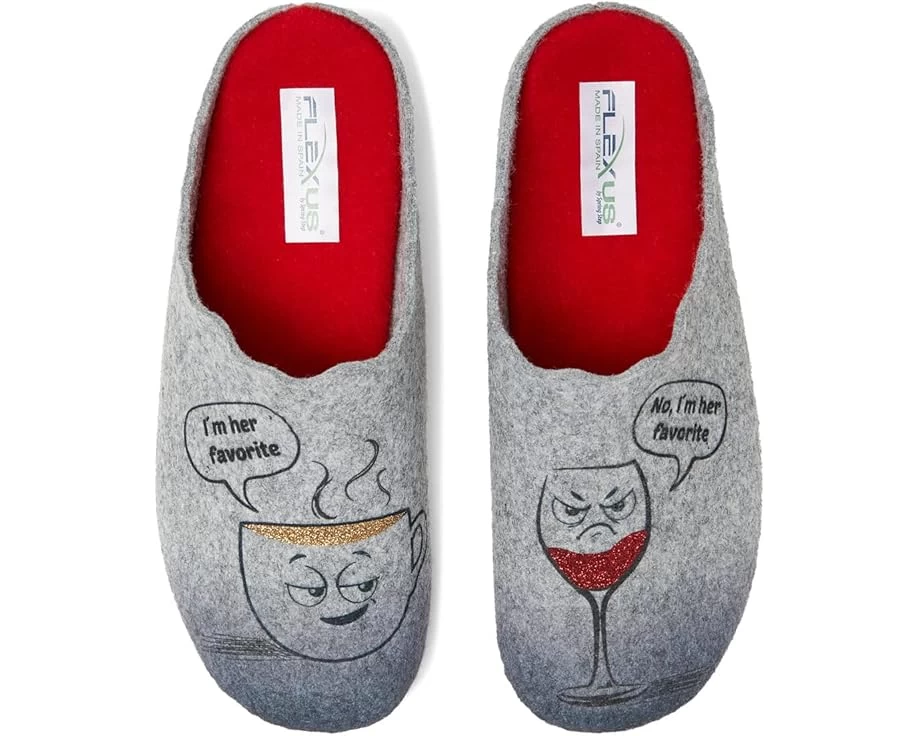 Please note that the brand is currently transitioning from Fly Flot® to FlexUs™ by Spring Step®. Although the footbed may be marked with either brand name, please know that you are still receiving the same great shoe.SKU: #9795383Ensure hours of comfort wearing the super-soft and comfy Flexus® Fav slippers. Textile upper, lining, and insole. Padded insole to ensure superior cushioning. Slip-on style. Round toe. Open back. Eye-catching print featuring a coffee mug on one shoe and martini glass on the other.Scalloped collar for added style. Glitter accents for added style. Synthetic outsole with high traction and durability. Made in Spain. Product measurements were taken using size EU 40 (US Women’s 9), width M. Please note that measurements may vary by size.Measurements: