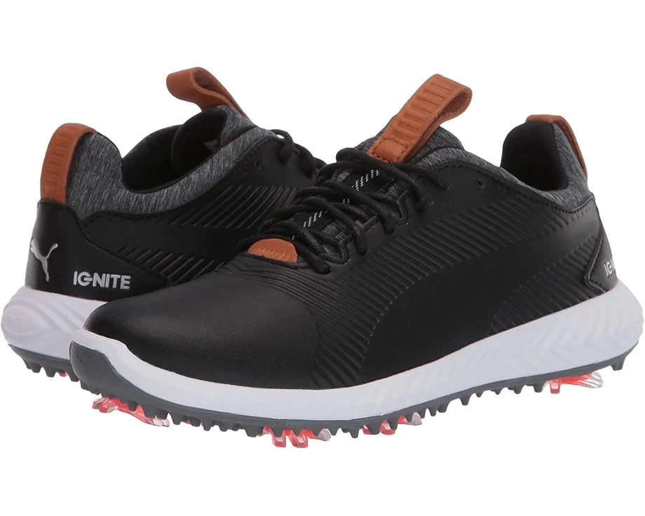 Energize their game with the PUMA® Ignite Pwradapt 2.0 golf shoe. SKU: #9345920Performance Mesh upper with low-profile silhouette.Lace-up closure for a custom fit.Ultra-thin PWRFRAME® reinforcement in high-stress areas. IGNITE foam offers golfers with responsive energy return, comfort, and stability. Textile lining with heavy gauge thread offer quality comfort.Padded insole for all-day comfort. External TPU heel support. GripZone Traction outsole.2 year waterproof guarantee. Tornado Cleat provide added support and stability.Built on an Epic Tour Last.Imported.Product measurements were taken using size 5 Big Kid, width M. Please note that measurements may vary by size.Measurements: