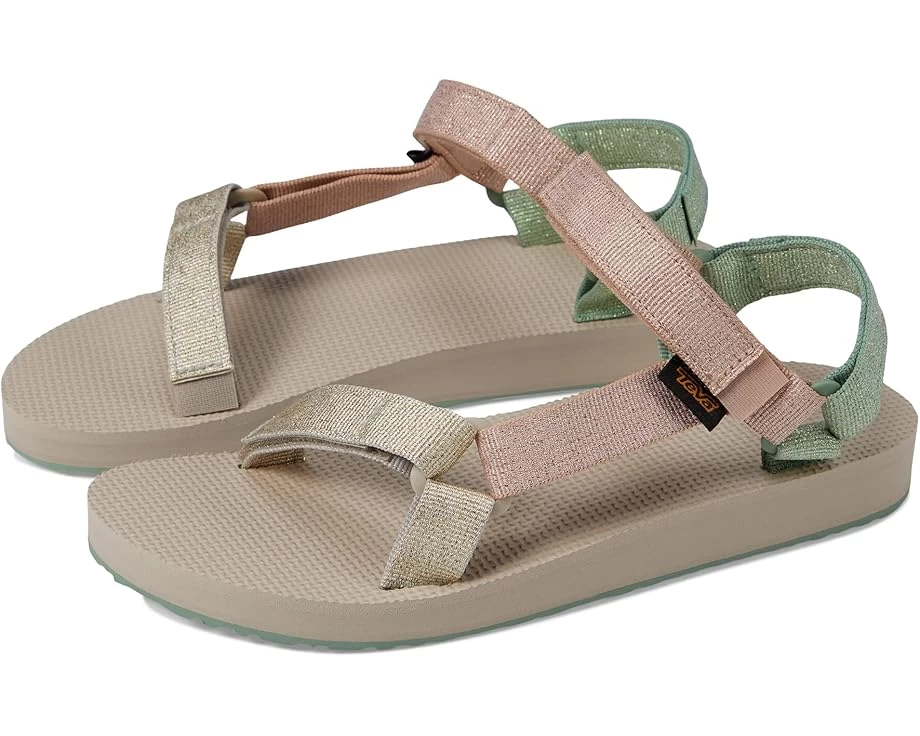 Verified vegan construction.SKU: #9611744The primary materials that compose this product contain a minimum of 20 percent recycled content.Go minimalistic wearing the lovely Teva® Kids Original Universal Metallic Sandals.REPREVE® polyester textile upper.Synthetic lining.Cushioned EVA footbed.Hook-and-loop closure.Hook-and-loop adjustable belt on upper toe area for better fit.Open round toe.Rubber outsole.Imported.Product measurements were taken using size 5 Big Kid, width M. Please note that measurements may vary by size.Measurements: