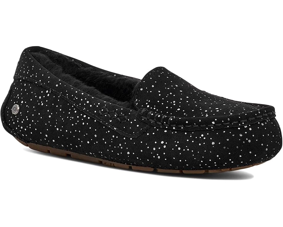 Live in lightweight UGG® Ansley Metallic Spots Slippers crafted with feather touch wool lining and a molded rubber sole that can be worn both indoors and outdoors.